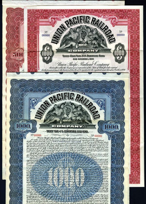 Lot of 3 Union Pacific Specimen Bonds, 1907, Listed railroad but unlisted bonds in Cox; 1)$500 4% 20 Year Specimen Bond with coupons attached. Black print with red border and underprint. Allegorical men flanking corporate logo top center. POC's and red SPECIMEN overprints. VF condition. ABNC. 2)$1000 3 1/2% 34 Year Specimen Bond with coupons attached. Black print with red border and underprint. Allegorical men flanking corporate logo top center. POC's and blue SPECIMEN overprints. VF condition with minor splitting along fold. ABNC. 3)$1000 4% 20 Year Specimen Bond with coupons attached. Black print with blue border and underprint. Allegorical men flanking corporate logo top center. POC's and red SPECIMEN overprints. VF condition. ABNC.