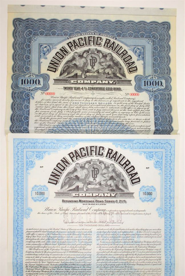 Utah, 1907 and 1946. Lot of 2 Specimen Bonds, Includes: 1907, $1000, 4% Convertible Gold Coupon Bond, Black on blue border and underprint, Allegorical males at top, Specimen overprints and POCs; and, 1946, $10,000, Registered 2 1/2% Refunding Mortgage Bond, Light blue border and underprint, Allegorical males at top, Pin punched Specimen. Both pieces are in XF condition, and were printed by ABNC. (2). Sold "AS IS" no returns accepted.