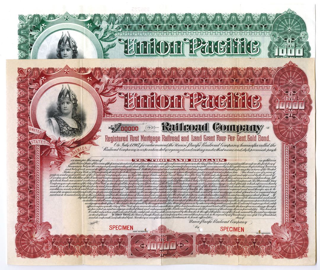 Utah. Lot of 2 Registered Bonds, Includes $1000, Green and $10,000, burgundy, Registered 4% Specimen First Mortgage Railroad and Land Grant Gold Bonds, horizontal format, Company title at top with allegorical woman at top left, Specimen overprints and POC's, VF-XF condition, ABNC. Rare and attractive bond from this historic railroad. (2)
