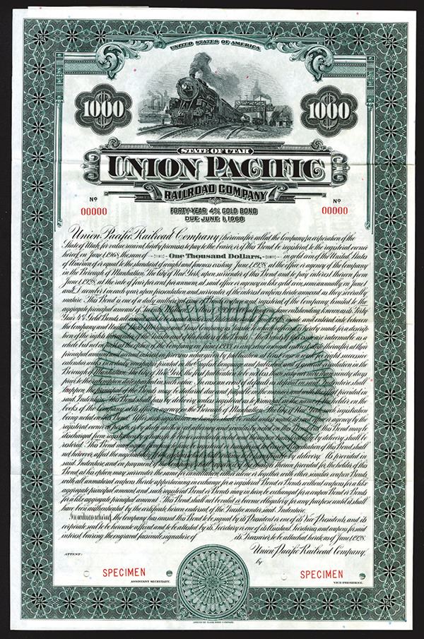 Utah. $1000, Specimen 4% Gold Coupon Bond, Black on green border and underprint, Locomotive under signal tower with flagman on right. Specimen overprints, VF-XF, ABNC. Unlisted date and design in Cox. Rare and attractive.