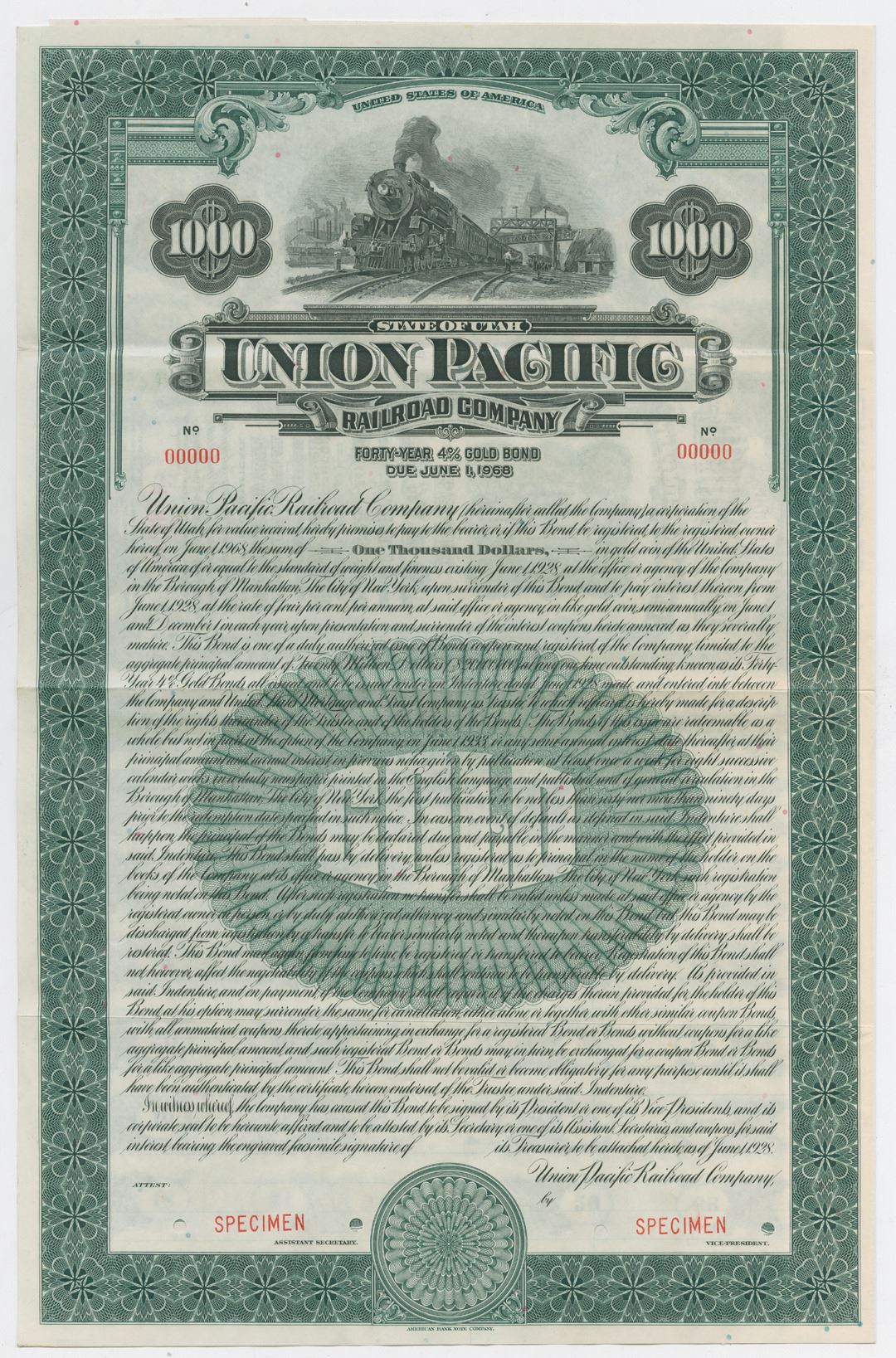 Utah. $1000, Specimen 4% 40 Year Gold Coupon Bond, Black on green border and underprint, Locomotive under signal tower with flagman on right. Specimen overprints, VF-XF, ABNC. Unlisted date and design in Cox. Rare and attractive.