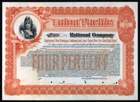 1xxx (ca.1890-1900's), $-Odd, 4% 1st Mortgage Railroad and Land Grant Gold Bond. Orange border w/ allegorical helmeted female warrior on left vignette. International BNC, Specimen, XF, Infrequently seen bond from this famous railroad, possibly only known as a specimen. Early troubles led to bankruptcy during the 1870s, the result of which was reorganization of the Union Pacific Railroad as the Union Pacific Railway on January 24, 1880, with its dominant stockholder being Jay Gould. The new company also declared bankruptcy, in 1893, but emerged on July 1, 1897, reverting to the original name, Union Pacific Railroad.