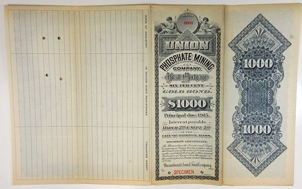 Union Phosphate Mining Co., 1895 $1,000 Specimen 6% Gold Bond, Fine-VF, ABNC.
