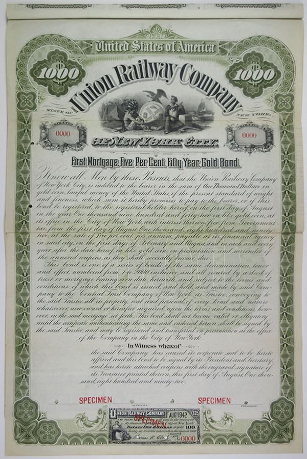 New York. $1000 Specimen 5% First Mortgage Gold Coupon Bond, Black text with olive green border and undertint, depiction of the seal of New York City at top. Red specimen overprints, "0000" serial numbers, and POC's, VF condition with very slight splitting along margins of middle fold, Printed by ABNC. Unlisted as a specimen in Cox. This is the only example found in the ABN archives and the only one ever available. Rare.