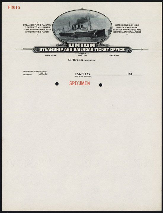 Paris, France, 1920's, Ship vignette on top of letterhead with company info, meant to be used from Paris office, Red SPECIMEN hand stamp and two security punches, XF condition, ABNC.