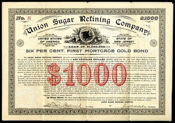 Union Sugar Refining Co., 1896 Bond. New Jersey, 1896, $1000 6% Gold Coupon Bond, I/U, VF condition.