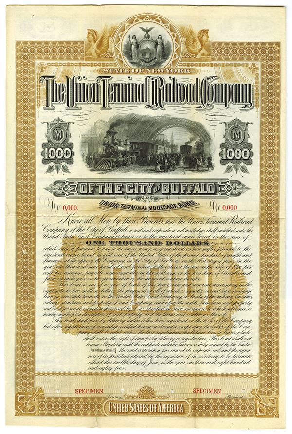 Buffalo, New York, $1000, Specimen 6% Mortgage Coupon Bond, Black on brown border and underprint, New York Arms at top, train in terminal under title, very impressive bond. Only 2 examples were found in the archives and this is unlisted as a bond in Cox.