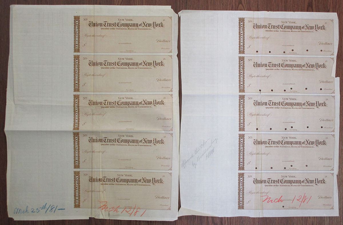 New York, 1881. Lot of 2 uncut sheets of 5 notes, both the same: Uncut proof check quintet, brown text with brown border and background. One with POCs. Fine-VF condition with approval initials in red at bottom on both pieces. Total of 10 checks. ABNC.