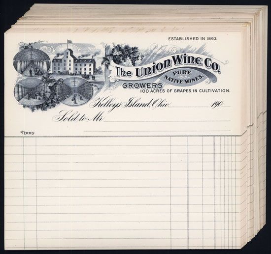 Kelly's Island, Ohio, 190x, Lot of 43 unused sheets with attractive multi-design logo including barrel storage room, grape pressing room, bottle storage, etc., some with a little aging or toning but majority fresh, VF to new condition.