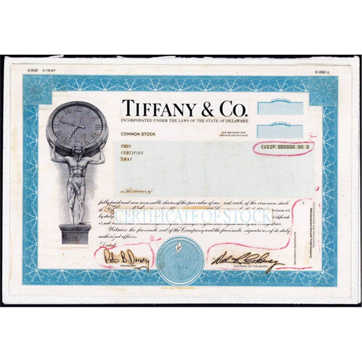 NY. 1987. Unique Approval Model or mockup for Odd 100 shares of common stock certificate in turquoise green. Certificate has been designed with different vignettes and design elements to cut to shape and pasted on a thin cardboard. Vignette of scantily clad “ “Father Time “ “ holding up a clock on his back. USBNC.