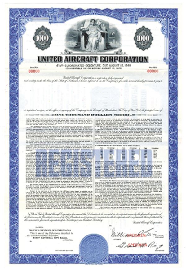 Delaware. $1000 Specimen 4 1/2% Registered Subordinated Debenture Bond, Black print on blue border and under tint, Allegorical woman seated on a throne at top, Specimen overprints and POC's, VF-XF condition, ABNC.