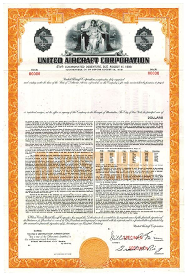 Delaware. $-Odd Specimen 4 1/2% Registered Subordinated Convertible Debenture Bond, Black print on orange border and under tint, Allegorical woman seated on a throne at top, Specimen overprints and POC's, VF-XF condition, ABNC.