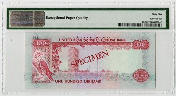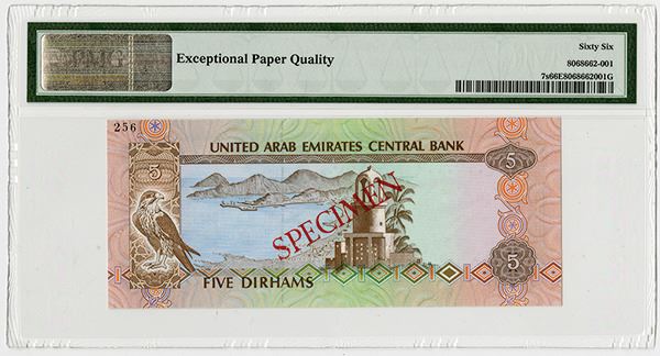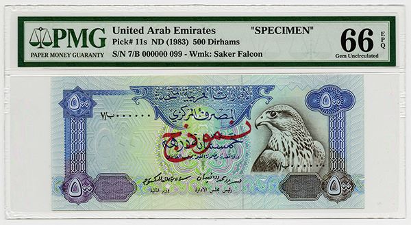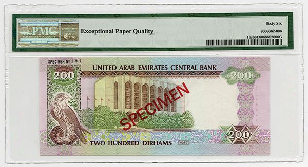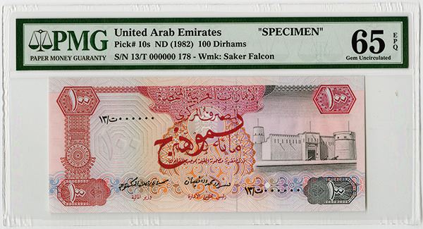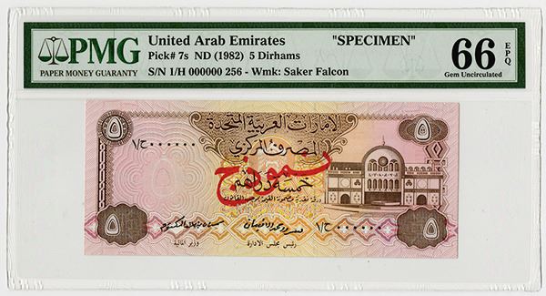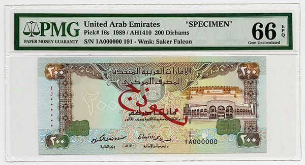 UAE, Lot of 6 notes, all Specimens, Includes 5 Dirhams, P-7s, PMG graded Gem Uncirculated 66 EPQ; 10 Dirhams, ND (1982), P-8s, PMG graded Gem Uncirculated 66 EPQ; 50 Dirhams, ND (1982), P-9s, PMG graded Gem Uncirculated 65 EPQ; 100 Dirhams, ND (1982), P-10s, PMG graded Gem Uncirculated 65 EPQ; 500 Dirhams, ND (1982), P-11s, PMG graded Gem Uncirculated 66 EPQ; 200 Dirhams, AH1410 (1989), P-16s, PMG graded Gem Uncirculated 66 EPQ; All with Arabic "000000" Serial Numbers and all but the 200 Dirhams, P-16s has perforated and SPECIMEN in English. All of the notes are fresh, brightly colored, have excellent embossing and sharp corners. Rare set of Middle Eastern notes. BW&C