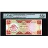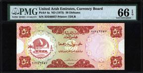 ND (1973), 50 Dirhams, P-4a, Issued banknote, S/N 3D246857, Red on m/c underprint, dhow with camel caravan, back Sheikh's Palace of Ajman. PMG graded "66 EPQ" Gem Uncirculated, Exceptional Paper Quality. Rare note in uncirculated and extremely rare in high grade. One of two sequential serial number notes of this issue in the auction and both are Gems.