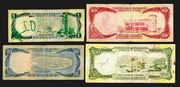 United Arab Emirates. Lot of 4 issued notes from the first 1973 issue. Includes 1 Dirham, P-1; 10 Dirhams, P-3; 50 Dirhams, P-4; and 100 Dirhams, P-5. The first Emirates issue is becoming increasingly scarce and sought after, particularly the higher denominations of which two are included in this lot. The notes are generally in Fine condition with some ink markings.