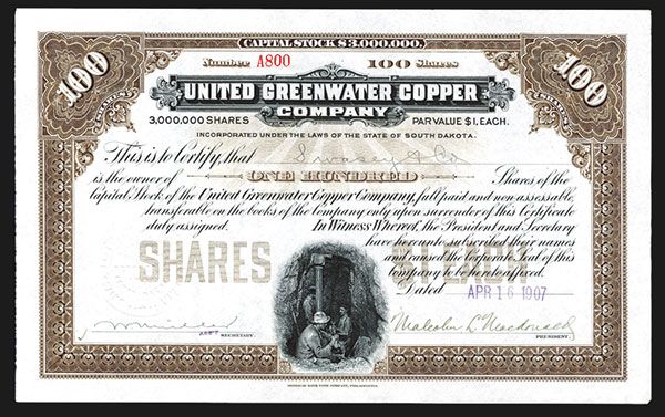Mines located in Death Valley, California (Incorporated in SD), 100 Shares, XF, Black on brown underprint and border with miners, XF condition, it was organized by Malcolm L. MacDonald, president of the Nevada Smelting & Mines Corporation, for the purpose of operating 15 claims on the eastern extension of the ledges of the Greenwater & Death Valley. ABNC
