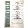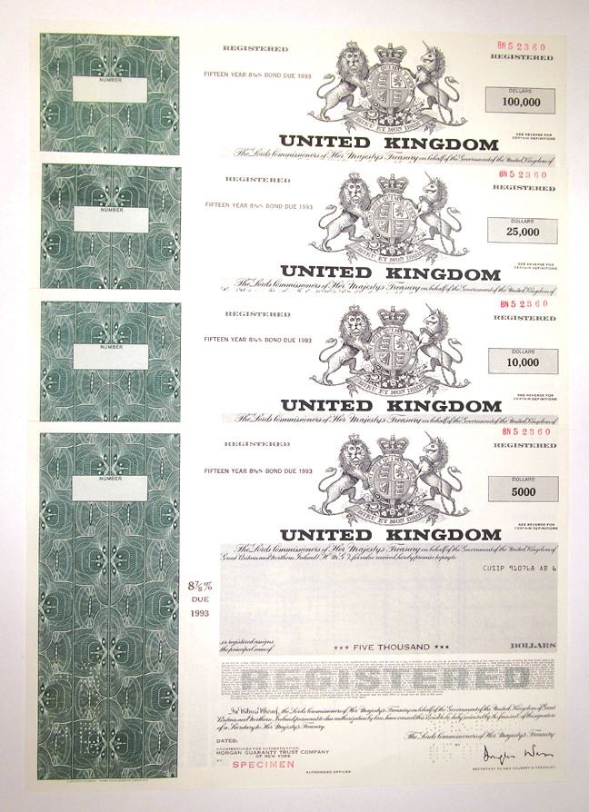 United Kingdom, 1978. Lot of 4 different Specimens, all are 8 7/8% Registered Bonds in green, Includes: $5000; $10,000; $25,000; and $100,000. Pin-punch specimen overprints and red specimen overprints. Supported Arms of Lion and Unicorn at top center. The bond states "The Lord Commissioners of Her Majesty's Treasury, on behalf of the Government of the United Kingdom, Great Britain, and Northern Ireland (HMG)....". All are Uncirculated to CU condition, All 4 are government bonds. SC-USBN. (4)
