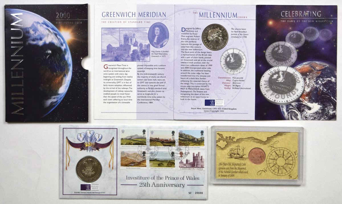 United Kingdom, 1809-2000. Lot of 3 coins and medals including an 1809 Admiral Gardner shipwreck coin, a copper East India Co. cash coin recovered from the wreck site and mounted in a presentation holder with descriptive insert; a 1969 Investiture of the Prince of Wales commemorative medal housed in its original Royal Mint holder and First Day Cover envelope marking the 25th anniversary of the investiture, struck in sterling silver (.925 fineness) and weighing approximately 20 grams, giving an actual silver weight (ASW) of approximately 18.5 grams (0.595 troy oz); and a 2000 Millennium £5 Crown (Greenwich Meridian issue) housed in its original Royal Mint presentation folder, struck in cupro-nickel (28.28 grams) with no silver content. Items remain housed in their original folders and presentation holders. (3). Sold “AS IS” no returns accepted.