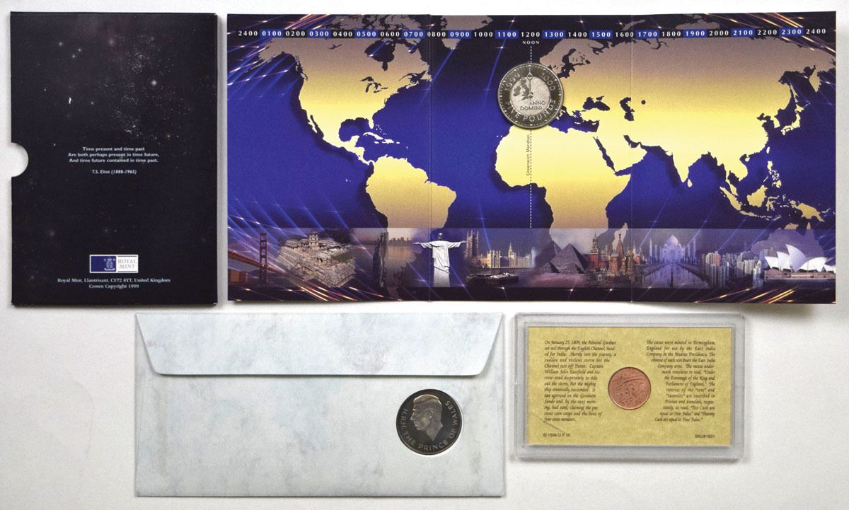 United Kingdom, 1809-2000. Lot of 3 coins and medals including an 1809 Admiral Gardner shipwreck coin, a copper East India Co. cash coin recovered from the wreck site and mounted in a presentation holder with descriptive insert; a 1969 Investiture of the Prince of Wales commemorative medal housed in its original Royal Mint holder and First Day Cover envelope marking the 25th anniversary of the investiture, struck in sterling silver (.925 fineness) and weighing approximately 20 grams, giving an actual silver weight (ASW) of approximately 18.5 grams (0.595 troy oz); and a 2000 Millennium £5 Crown (Greenwich Meridian issue) housed in its original Royal Mint presentation folder, struck in cupro-nickel (28.28 grams) with no silver content. Items remain housed in their original folders and presentation holders. (3). Sold “AS IS” no returns accepted.
