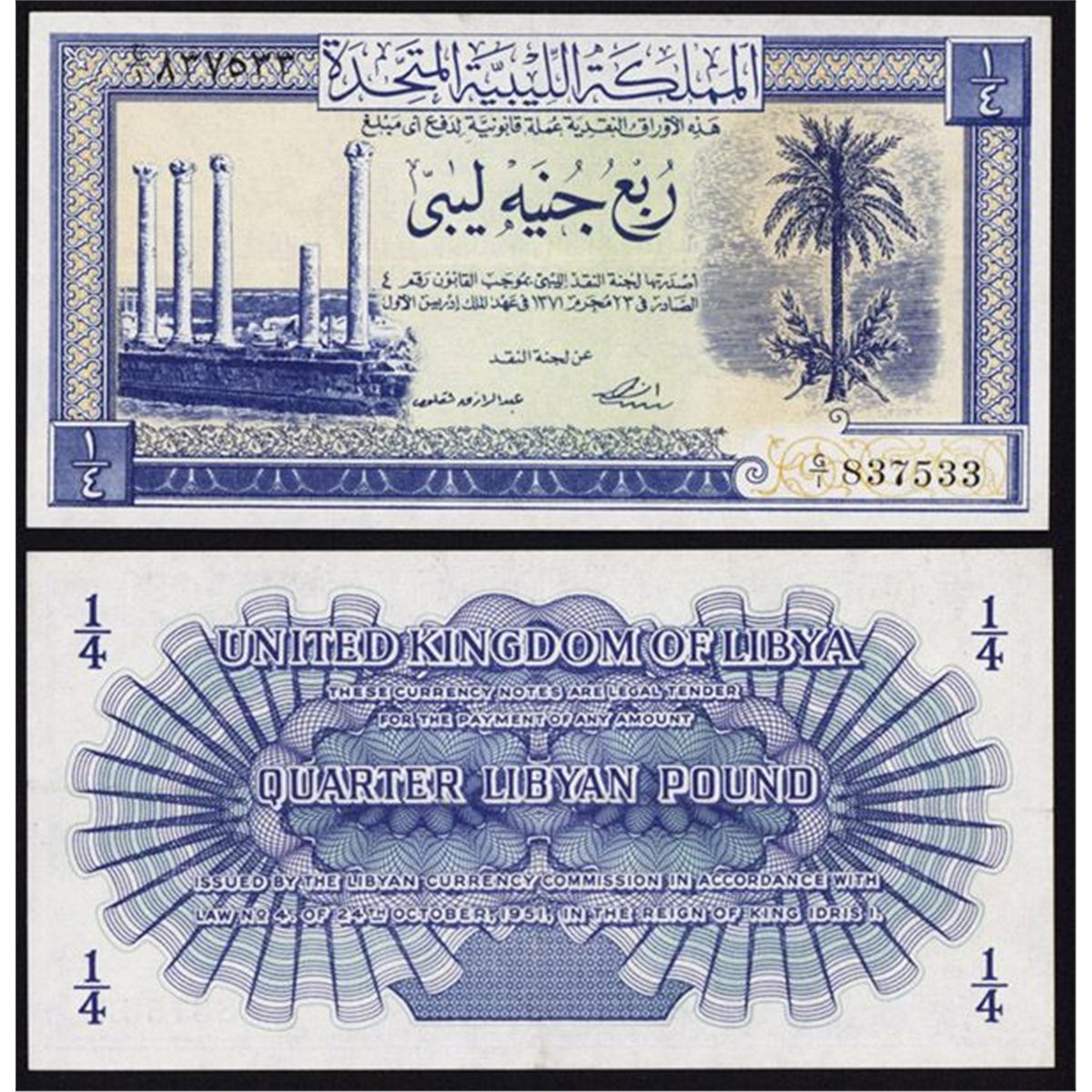 Libya, Lot of 4 notes, Includes, 1/4 Pound, P-7, Choice XF-AU; 1/4 Pound, P-14, Choice VF; 1/2 Pound, P-15, Fine with nick on bottom middle; and, 1 Pound, P-1, Fine. Attractive group of notes.