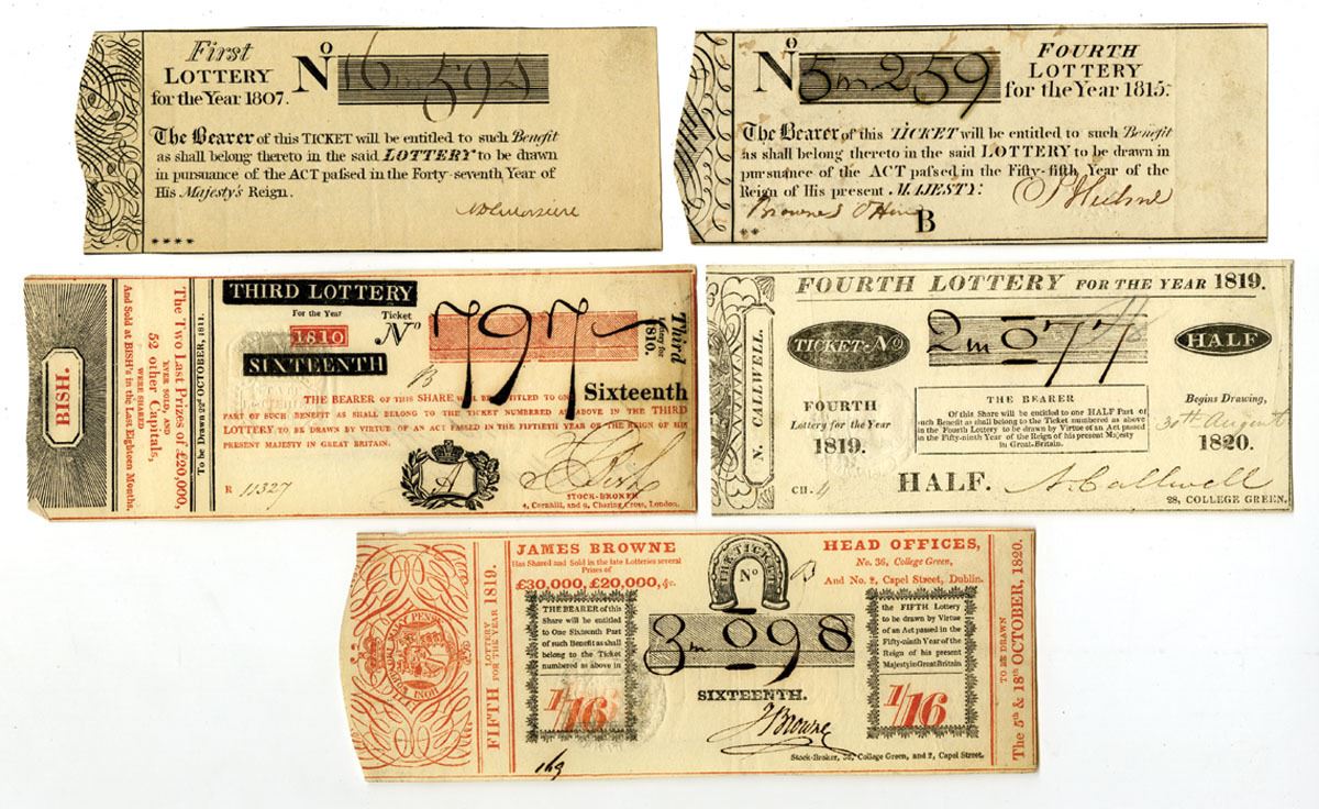 United Kingdom, Lot of 5 illustrated lottery tickets, Includes 1807, first Lottery for the Year 1807; 1810, Bish, Third Lottery for the year 1810, black on red, list of prizes on left; 1815, Fourth Lottery for the year 1815; 1819, James Browne, Fifth Lottery for the year 1819, black on red, ornate counterfoil on left in red; and, 1819, N. Calwell, Fourth Lottery for the year 1819, half ticket, all are in VF to XF condition. Attractive lottery ticket group. (5)