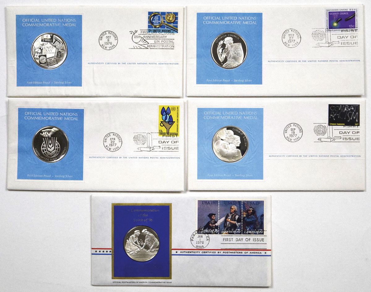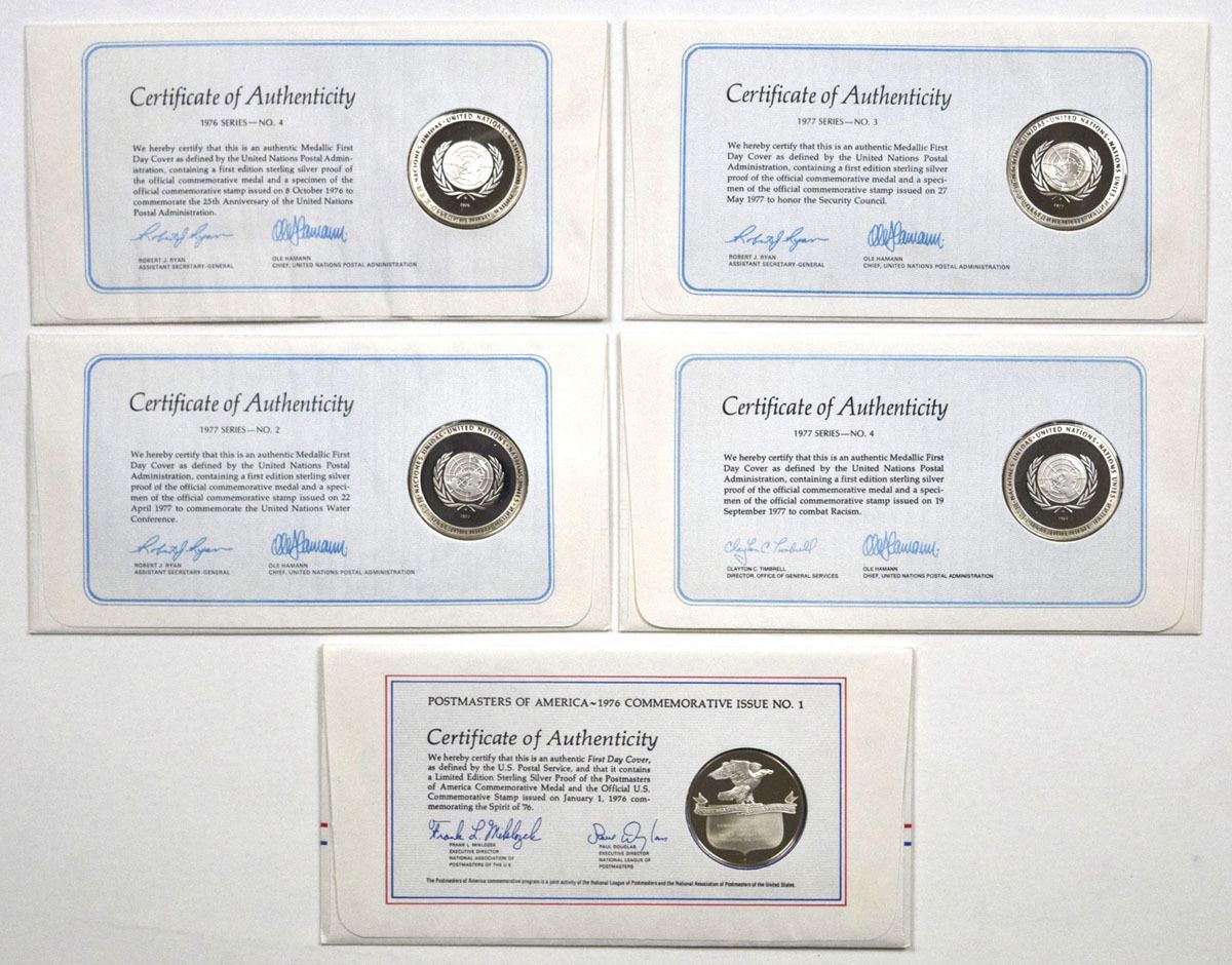 United Nations, 1976 to 1977. Lot of 5 First Edition Proof commemorative medals issued by the United Nations Postal Administration, each mounted within official First Day Cover envelopes with commemorative stamps and cancellation marks. Medals are struck in .925 fine silver, each weighing approximately 24 grams and measuring about 39 mm in diameter. Total weight of all 5 medals is 111 grams, with actual silver weight (ASW) of (3.5 troy oz). Estimated Melt with Silver at $80 ounce is $280. Housed in original covers with postal cancellations. (5). Sold “AS IS” no returns accepted.