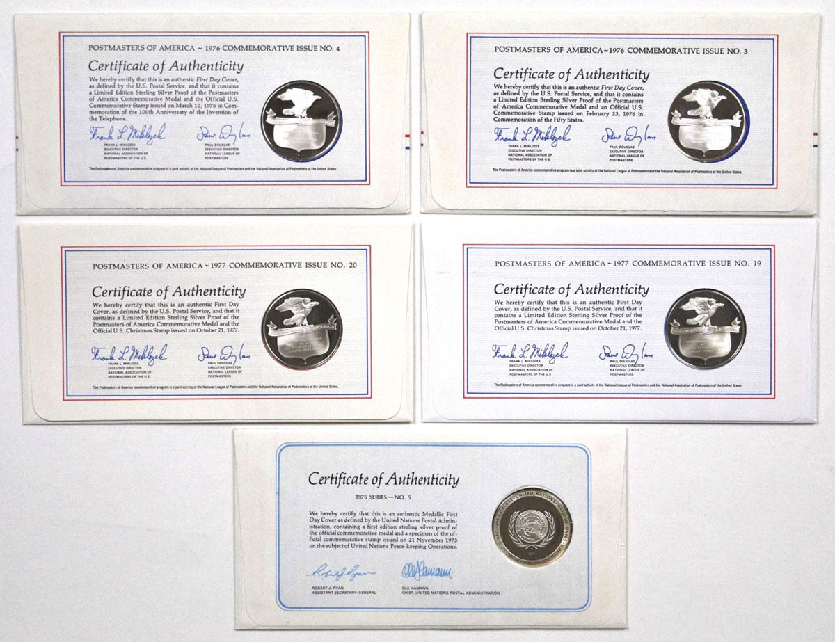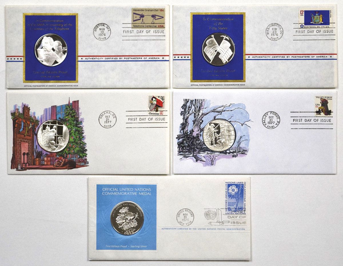 United Nations and U.S., 1976 to 1977. Lot of 5 First Edition Proof commemorative medals mounted within official First Day Cover envelopes with commemorative stamps and cancellation marks. Designs commemorate themes including Alexander Graham Bell and the Invention of the Telephone, the Ship of the Pilgrims, United Nations Environmental themes, and Valley Forge. Medals are struck in .925 fine silver, each weighing approximately 24 grams and measuring about 39 mm in diameter. Total weight of all 5 medals is 111 grams, with actual silver weight (ASW) of (3.5 troy oz). Estimated Melt with Silver at $80 ounce is $280. Housed in original covers with postal cancellations. (5). Sold “AS IS” no returns accepted.