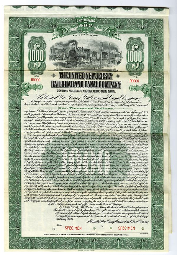New Jersey. $1000 Specimen 4 1/2% General Mortgage Gold Coupon Bond, Black print on green border and under tint, Locomotive at station at top, Specimen overprints and POC's, VF-XF condition, ABNC.