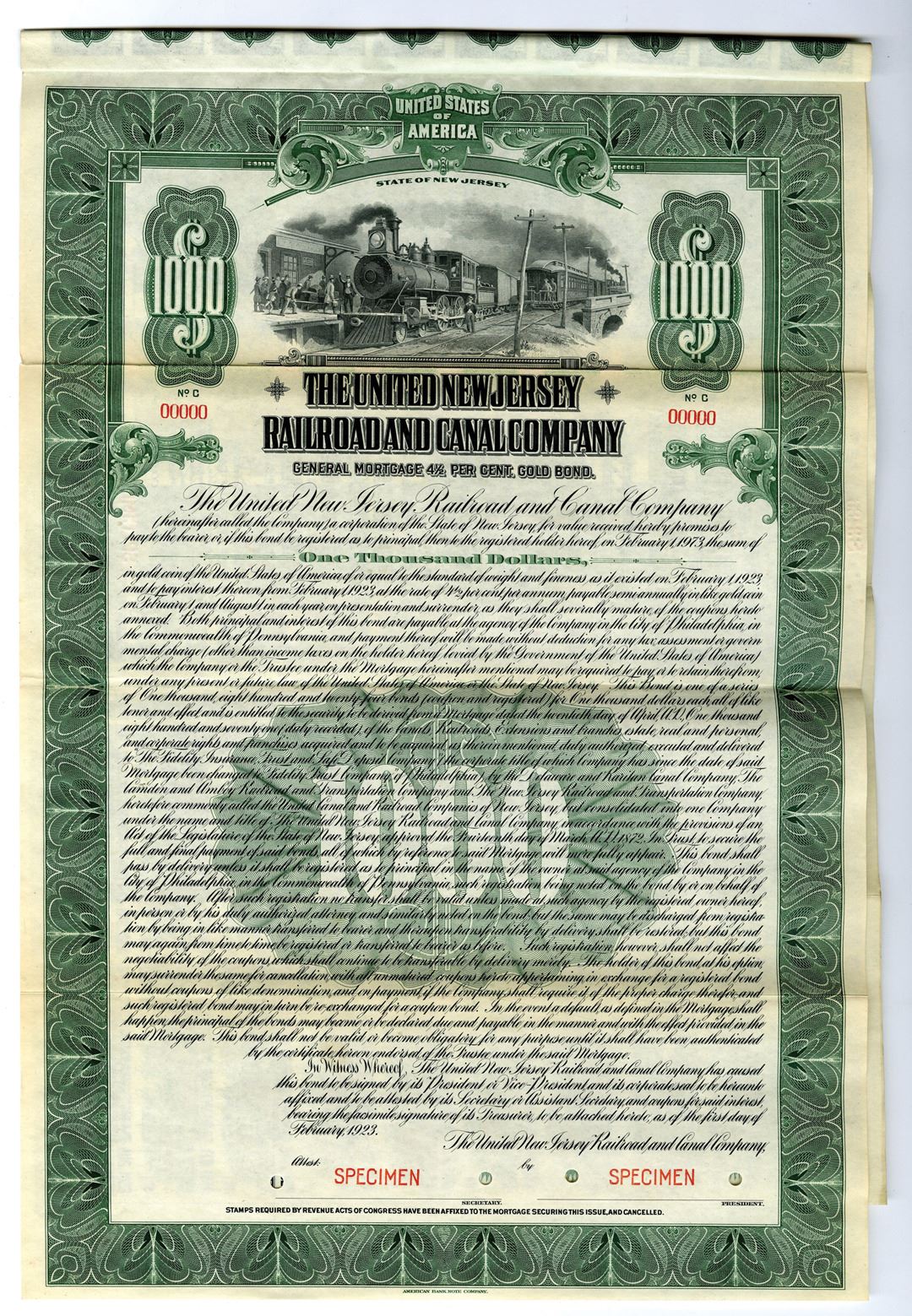 New Jersey. $1000 Specimen 4 1/2% General Mortgage Gold Coupon Bond, Black print on green border and under tint, Locomotive at station at top, Specimen overprints and POC's, VF-XF condition, ABNC.
