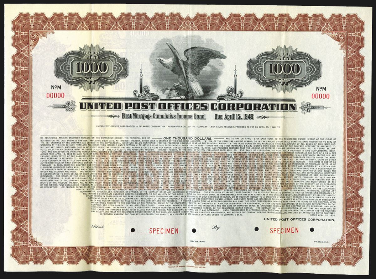 Specimen $1000 5 1/2% Registered Bond. Red "Specimen" overprints, "00000" serial numbers and POC's. XF condition. Screaming eagle on top. FLD-ABNC.