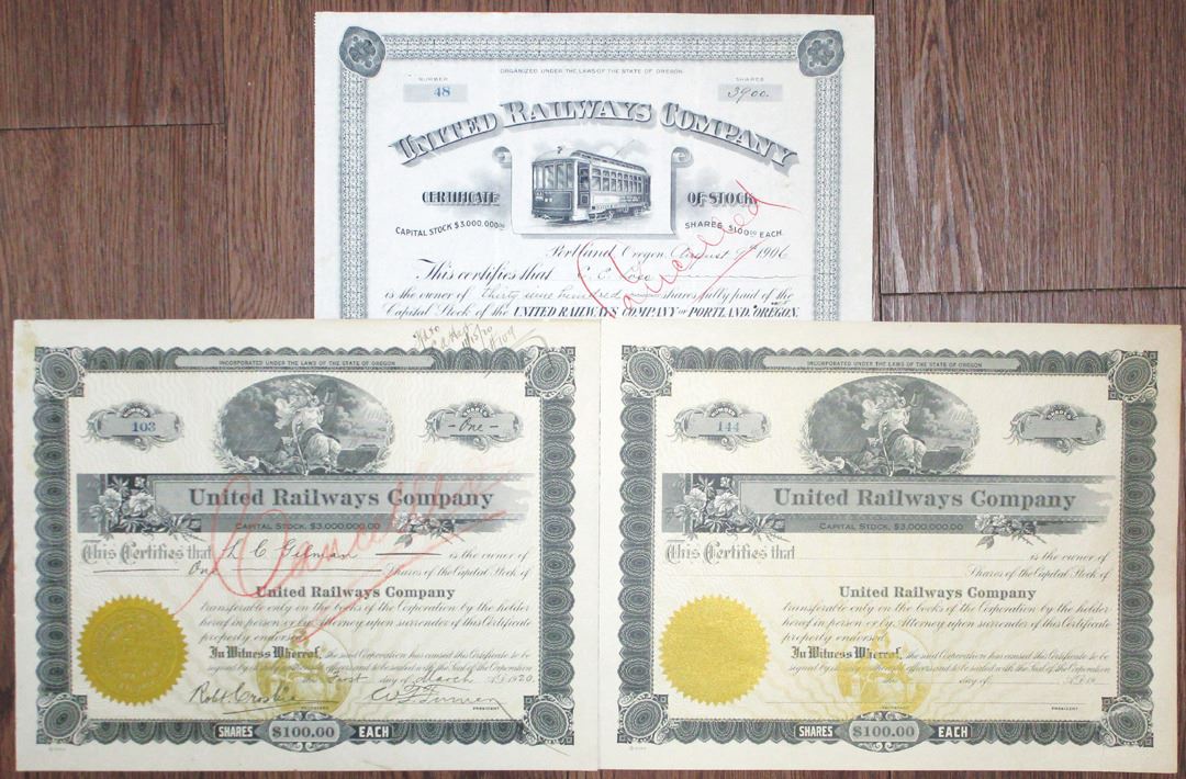 Oregon. Lot of 3 stock certificates, Includes 1906, 3900 Shares I/C Capital Stock Certificate, S/N 48, in black with electric inter-urban street car in middle; 1920, 1 Share I/C Capital Stock Certificate, S/N 103, in black and gold with seated allegorical woman; and ND (1920s) Odd Shares U/U Capital Stock Certificate, S/N 144, in black and gold. All are in VF except for the unissued certificate, with small tear at bottom right. Unlisted railroad in Cox. Rare western railroad. (3)