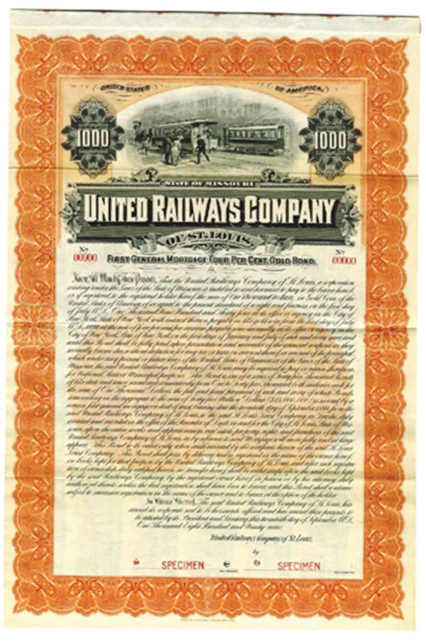 Missouri. $1000 Specimen 4% 1st General Mortgage Gold Coupon Bond, Black print on large orange border and under tint, People crossing in front of streetcars at top, Specimen overprints and POC's, Fine-VF condition, ABNC.