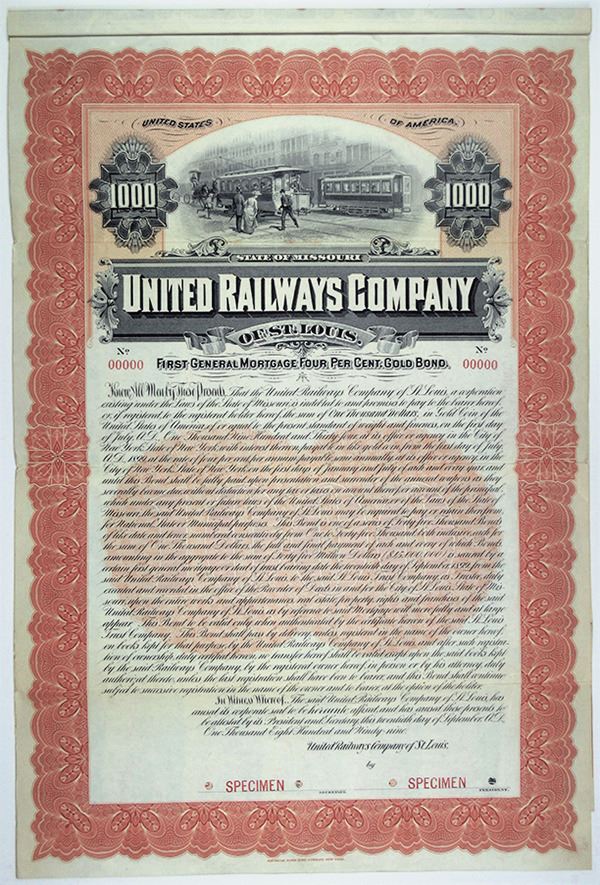 Missouri. 1899, $1000 Specimen 4% First General Mortgage Gold Coupon Bond, Black text with orange border and undertint, Illustration of two trolleys passing by passengers in a city. Red specimen overprints, "00000" serial numbers, and POC's, VF condition, ABNC. Unlisted railroad in Cox.