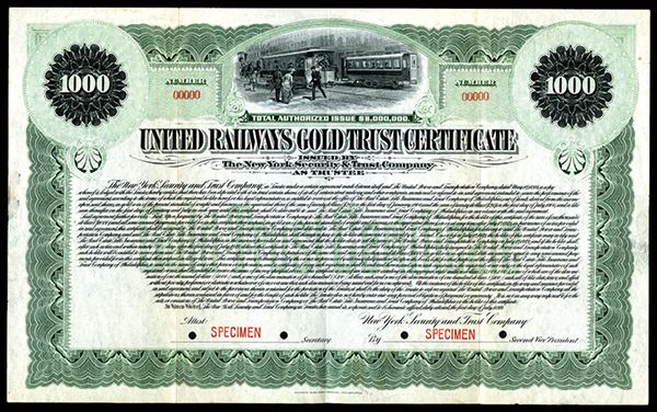 United Railways Gold Trust, 1899 Specimen Bond. Philadelphia, Pennsylvania. 1899, $1000 Specimen Registered Gold Bond. Black with green border an underprint, Street cars with people and horse and buggy. Specimen overprint, POC, VF-XF, ABNC-Philadelphia. Unlisted railroad on Cox.