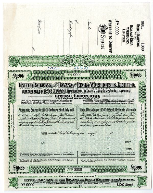 Cuba, 1927. 1000 Pounds Ordinary Stock, Specimen 5% Cumulative Preference Stock Certificate in Spanish and English, Black text with green border and undertint. 0000 serial numbers and POCs. Fine condition with some writing in blue ink at top center. BW&C.