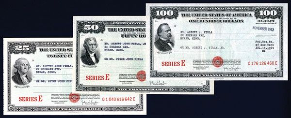 1941-45. 3 different savings bonds, all Series E U.S. Savings Bonds. Includes 1945, $25, Washington vignette. Snyder signature, Unc.; 1941, $50, Jefferson vignette. Snyder signature, Unc.; and 1942, $100, Cleveland vignette. Snyder signature, Printed by the BEP. Attractive trio of bonds.