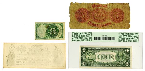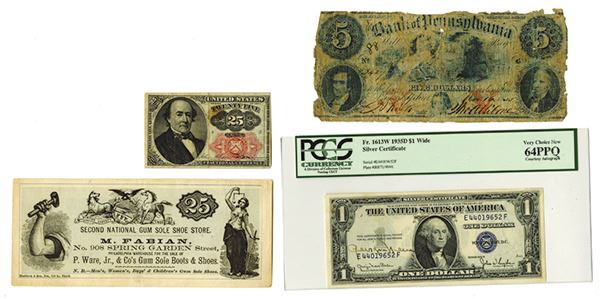 Includes 1 Dollar, 1935 D, with courtesy autograph of Treasurer Georgia Neese Clark, PMG graded Very Choice New 64 PPQ; Fractional 25 Cents, 1874, Fine; Obsolete Bank of Pennsylvania 5 Dollars, 1855, Fair; and 25 Cents Scrip Note from the Second National Gum Sole Shoe Store (Philadelphia PA), Very Fine.