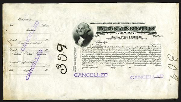Pennsylvania. Odd Shares, Proof Stock certificate, Black printing only, no border or undertint, Washington on upper left, Purple cancelled overprints and crayon numerals referring to the printing plate number. This was the cancellation impression for the company's records. Fine. Republic BNC. Rare if not unique.