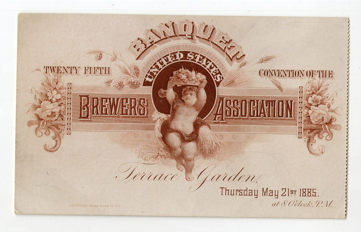 Terrace Garden, New York City. 1885 Banquet Ticket for U.S. Brewers Association, Intaglio printed in light orange-brown on thin white card, 5.25 x 3.25 inches, Perforated on right where stub was removed, Cherub in middle under title, flowers on left and right. The banquet was held at the well known Terrace Garden which was located on Lexington Ave., between 58th and 59th Streets. XF with light toning on the left. Printed by ABNC. First time seen by us.