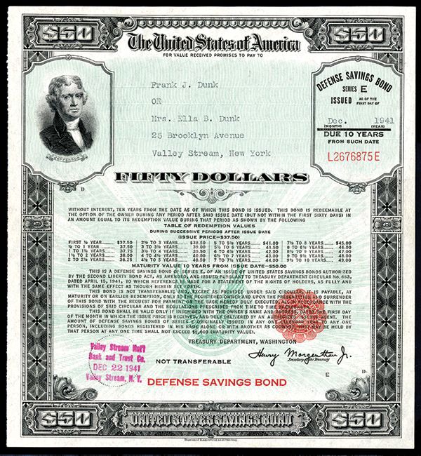 United States Defense Savings Bond $50.00: Schwan/ Boling # 222b Narrow Frame. PCGS GEM 66 PPQ: SR. # L2676875E. From the Patriot Collection features a Defense Savings Bond issued within two weeks after the bombing at Pearl Harbor. While Defense Savings Bonds show up from time to time, finding one in this pristine condition is quite rare as shown by the grade. This bond has wonderful centering and paper quality and just millimeters away from Superb Gem! In Extra Fine grade this bond catalogues at $400.00. A candidate for a Registry Set