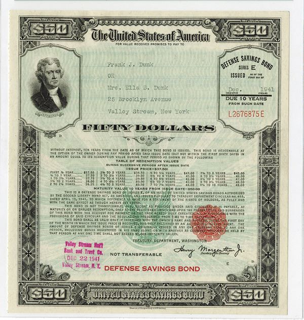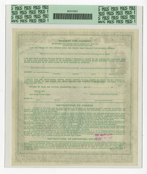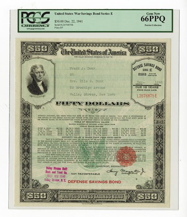 PCGS GEM 66 PPQ: SR. # L2676875E. From the Patriot Collection features a Defense Savings Bond issued within two weeks after the bombing at Pearl Harbor. While Defense Savings Bonds show up from time to time, finding one in this pristine condition is quite rare as shown by the grade. This bond has wonderful centering and paper quality and just millimeters away from Superb Gem! In Extra Fine grade this bond catalogues at $400.00. A candidate for a Registry Set