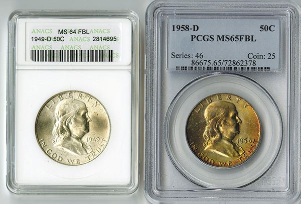 Includes 50 Cents, 1958 D, KM# 199, PCGS graded MS 65 FBL; and 50 Cents, 1949 D, KM# 199, ANACS graded MS 64 FBL. (2) pieces.