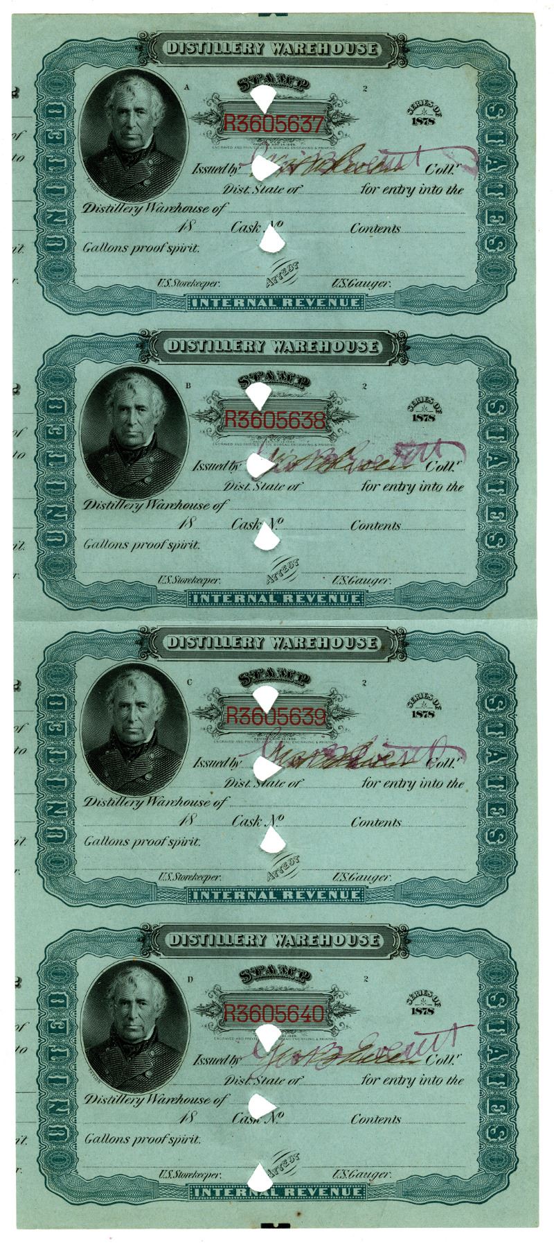 Lot includes 4 Uncut pieces, all are: Partially Issued/Cancelled Distillery Warehouse Internal Revenue Stamps, Black text with green border printed on blue-green paper, features a portrait of President Zachary Taylor at left, POCS. VF condition, Bureau of Engraving & Printing. (4)