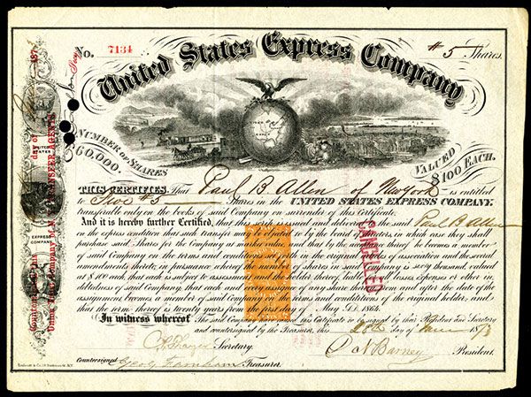 New York. 1873. 5 Shares, I/C Stock. #7134. Black print with simple black border and vignette top center of globe flanked by a port city and railroads in the countryside. VF condition. Endicott & Co. Imprinted Orange 5 cent revenue stamp center.