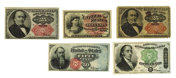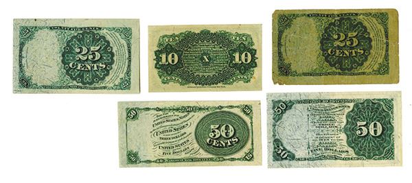 Includes 50 Cents, 4th issue, P-120, Very Fine; 50 Cents, 4th issue, P-121, Uncirculated; 25 Cents, 5th issue, P-123 (2 pcs, 1 Fine, 1 Uncirculated); and 10 Cents, 4th issue, P-115, Choice About Uncirculated.