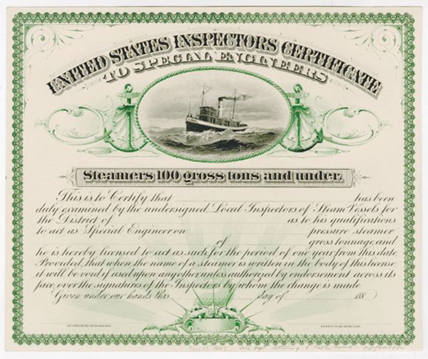 Specimen inspection certificate, "To Special Engineers - Steamers 100 gross Tons and Under". Black print on green border and under tint on thin card, Large ship at center below company title, VF-XF condition. Rarely seen Bureau of Engraving and Printing proof. BEP.