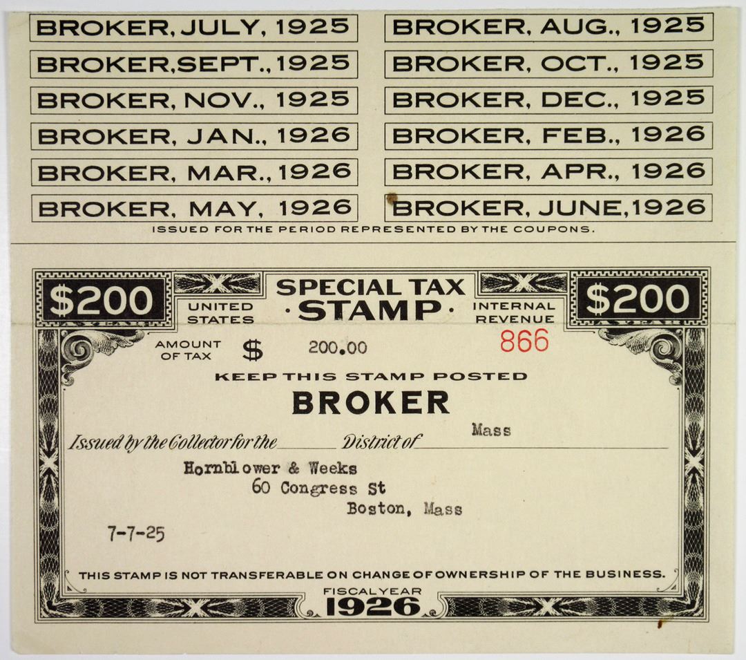 Massachusetts, 1926. $200 Special Tax Stamp by the Internal Revenue Service issued to Hornblower & Weeks. Hornblower & Weeks was an investment banking and brokerage firm founded by Henry Hornblower and John W. Weeks in 1888. At its peak in the late 1970s, Hornblower ranked eighth among member firms of the New York Stock Exchange in number of retail offices, with 93 retail sales offices located in the United States and Europe. Hornblower was active in financing automobile companies in the first half of the 20th century, including Dodge Motors, General Motors, and Hudson Motor Car Company.