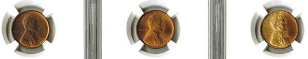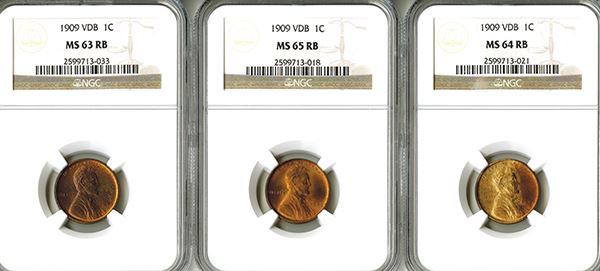 United States. Lincoln Cent, 1909 VDB. NGC MS 63 RB, MS 64 RB, MS 65 RB. 3 pieces.
