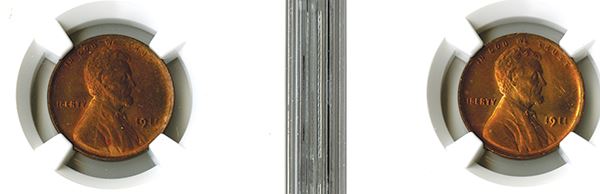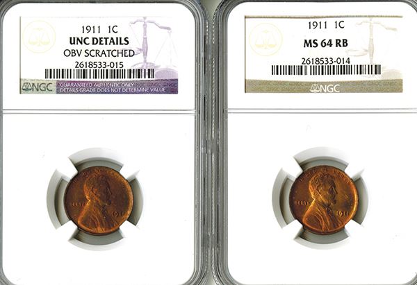 United States. Lincoln Cent, 1911. NGC MS 64 RB, NGC UNC DETAINS, obv scratched. 2 pieces.