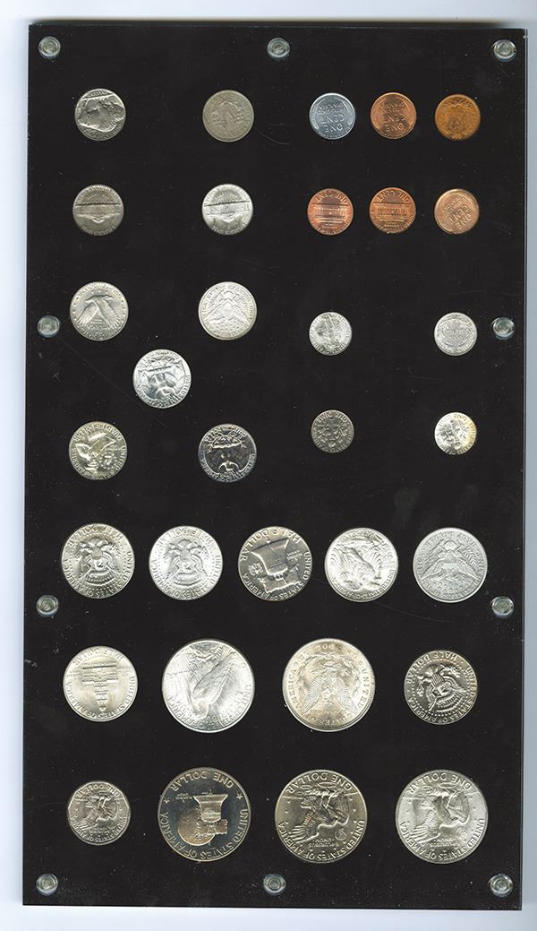 High grade type set of 20th Century US coins, mostly in uncirculated or proof condition, includes $1 1921, 1922S, 1971S, 1977, and 1981P; 50 Cents 1912, 1944, 1960, 1964, 1969D, 1776-1976S, and 1987D; 25 Cents 1914, 1926, 1959, 1776-1976S, and 1989P; 10 Cents 1902, 1944D, 1956, and 1969D; 5 Cents 1912D, 1937, 1942S, and 1952; and finally 1 Cent 1907, 1943, 1945, 1958, 1970, and 1982.